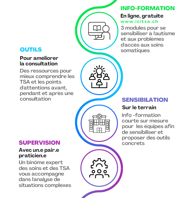 Ici-TSA est une plateforme d’info-formation en ligne pour les professionnels de la santé qui sont intéressés à faciliter l’accès aux soins des personnes autistes avec ou sans déficience intellectuelle.